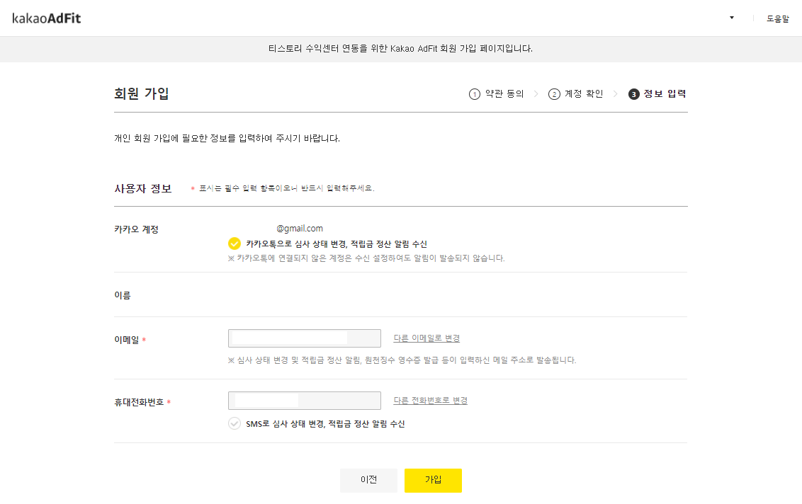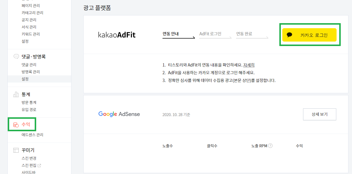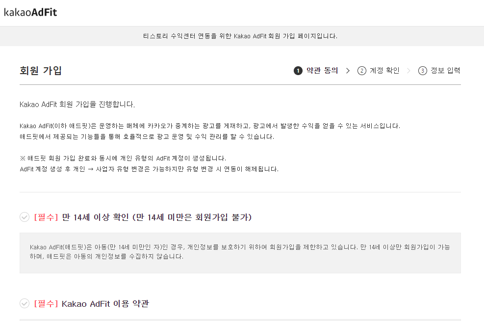 (대신 티스토리 계정과 카카오 계정이 연동되어야 한다. 블로그 수는 상관 없지만 카카오 수익 계정은 1개)