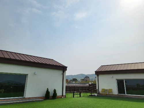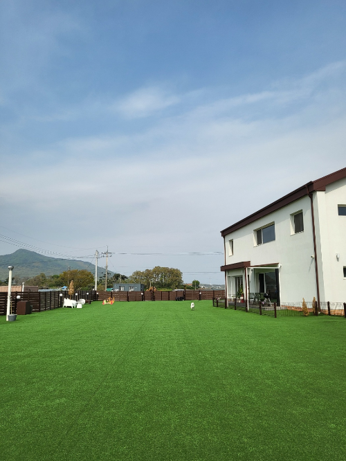 뽀아하우스는 3개의 독채와 개별 마당이 있고 공용 마당이 넓게 있다. 잔디는 인조 잔디!