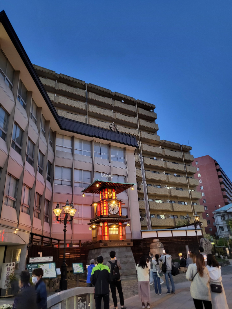 도고 온천역에 내리니 바로 옆에는 봇짱 열차가 있고 저 멀리서 봇짱 카라쿠리 시계탑 공연이 열리고 있었다.