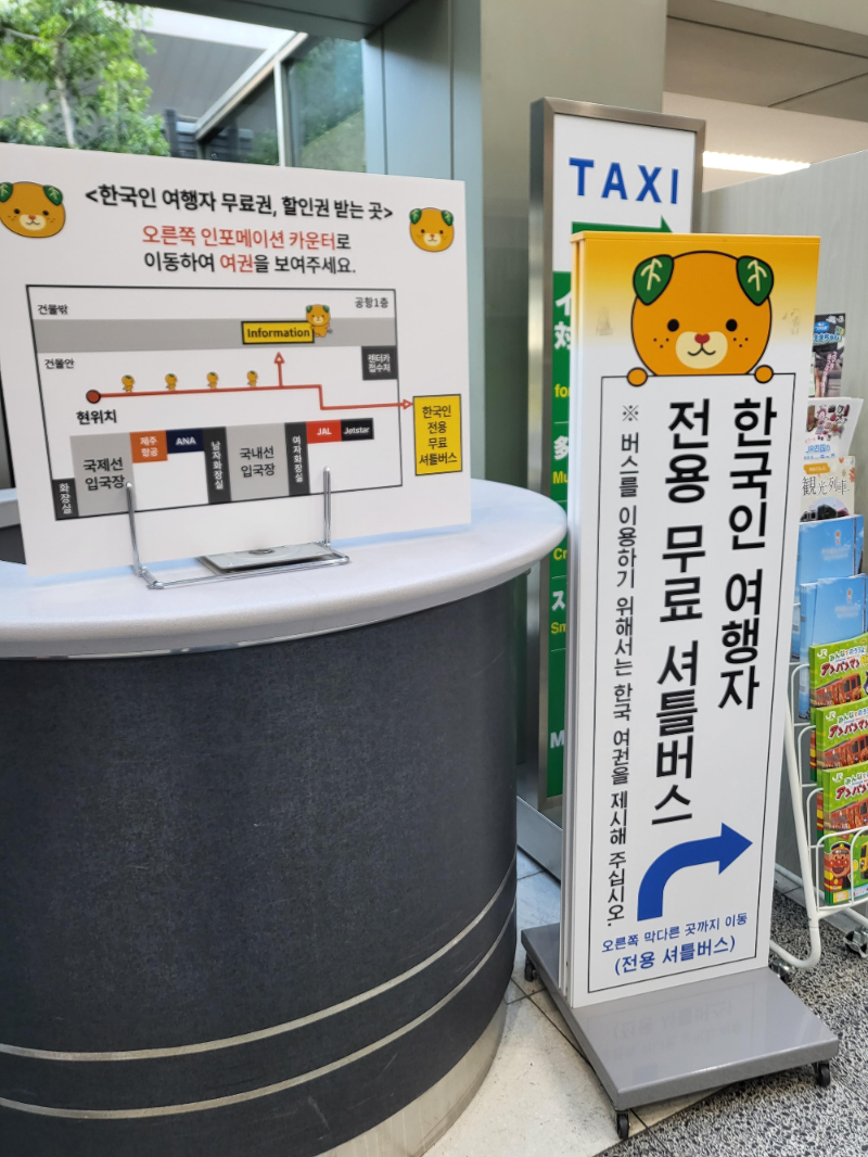 입국해서 오른쪽으로 쭉 가다 보면 한국인 전용 무료 셔틀버스 타는 곳이 나오는데 나가기 전, 중간에 작은 인포메이션을 찾아서 한국 여권을 보여주고 인당 1매씩 한국인 여행자 무료권을 받아야 한다. 한분만 앉아 계셔서 지나치기 쉬움!
