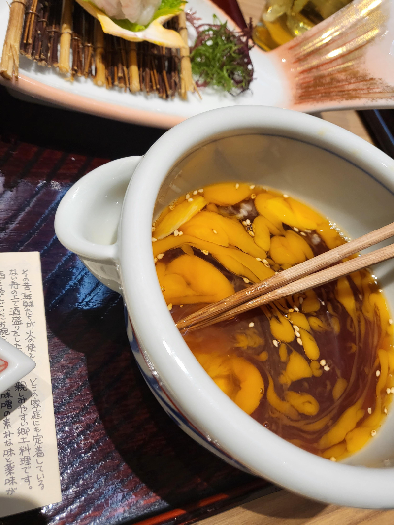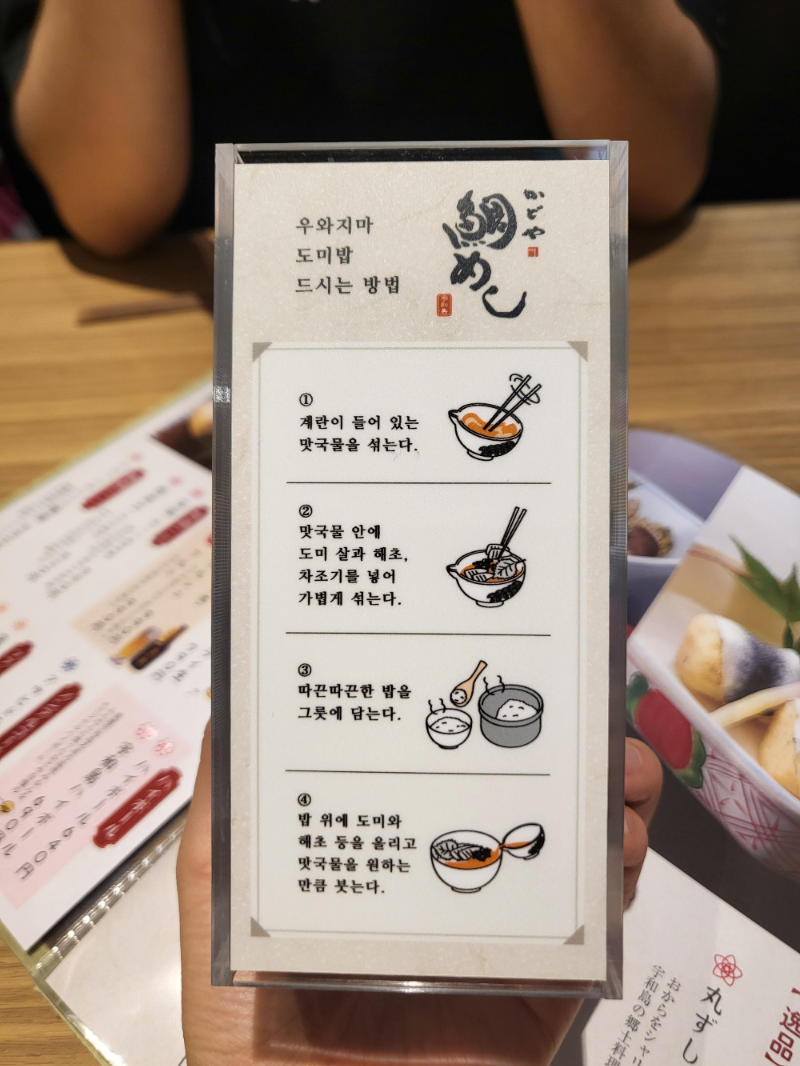 마쓰야마에는 두 가지 방식의 도미 덮밥이 있는데 익혀서 나오는 도미 솥밥과 회를 얹어 먹는 도미 덮밥 스타일이 있다고 한다.