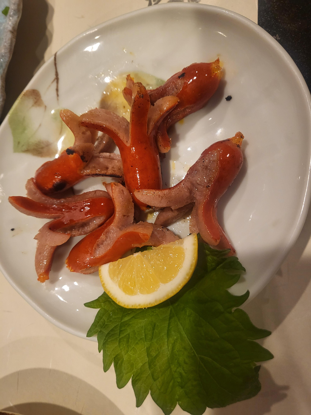 다찌 중간에 오스스메(추천) 메뉴가 칠판에 적혀있다. 손글씨라 번역기가 말을 잘 듣지 않지만 먹을 수 있는 게 나오겠지. 읽을 수 있는 것 시켜봤다. 더듬더듬 읽어서 주문한 레바(소 간?)랑 타코 비엔나.