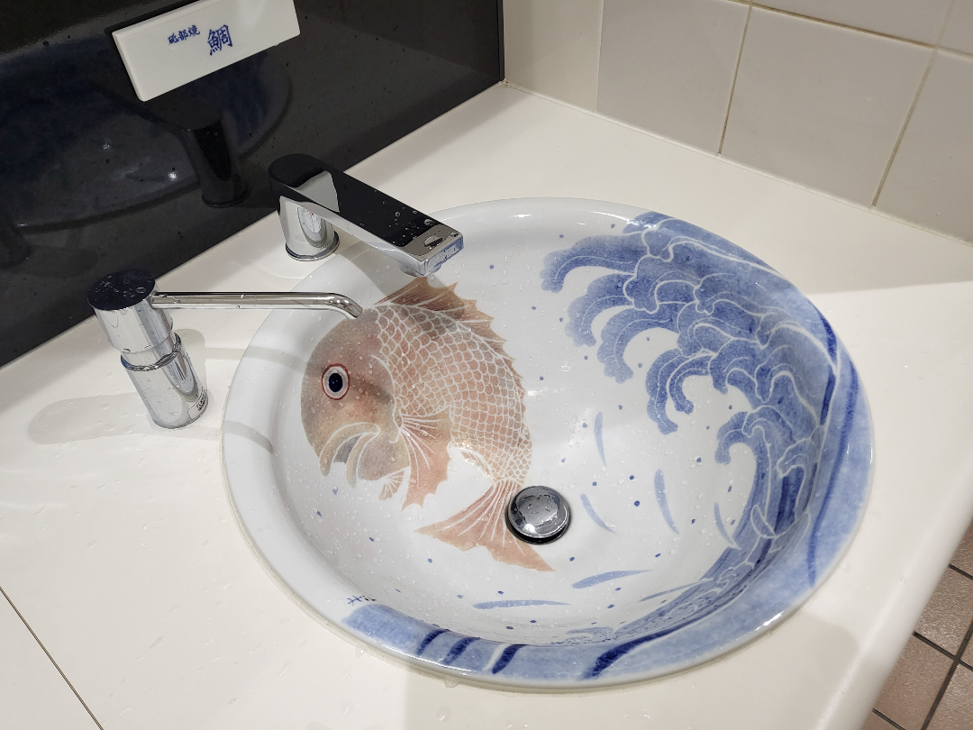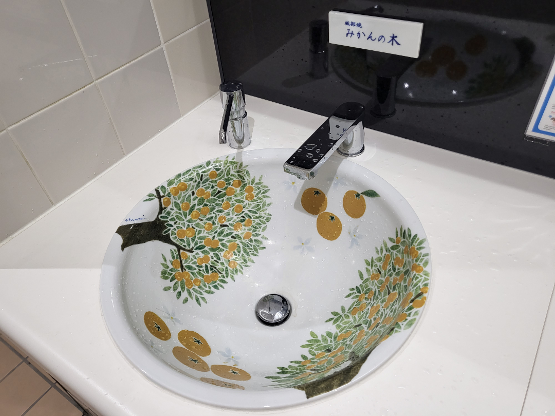 출국장 화장실이 더 특이하다. 세면대가 작품이어서 놀랐쟈나. 바다와 감귤 세면대.