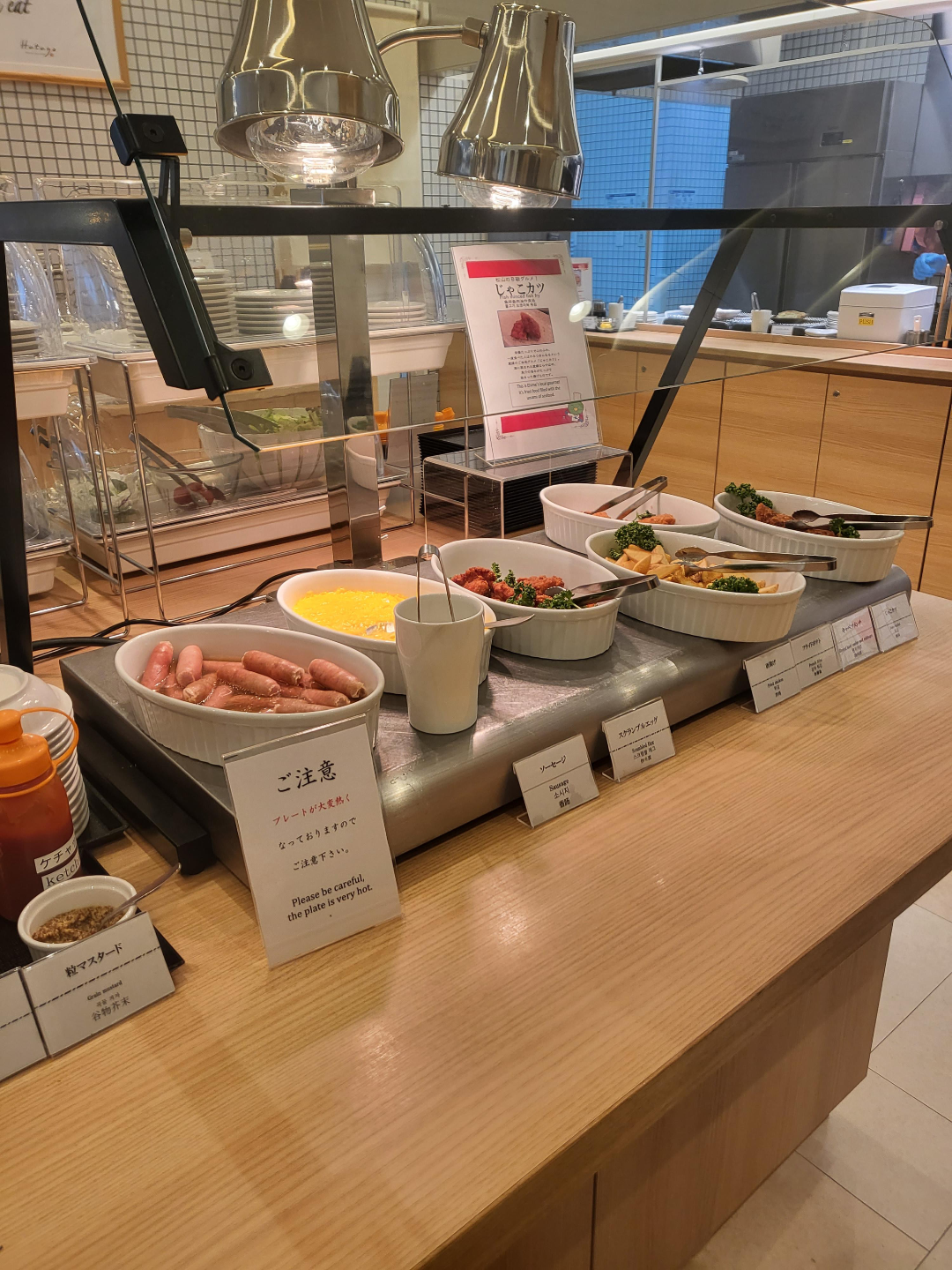 이런 소시지나 스크램블 에그 같은 일반 뷔페식도 있고 나물반찬이나 작은 연어구이, 도미 덮밥 같은 일본 가정식 반찬도 조금 있다.