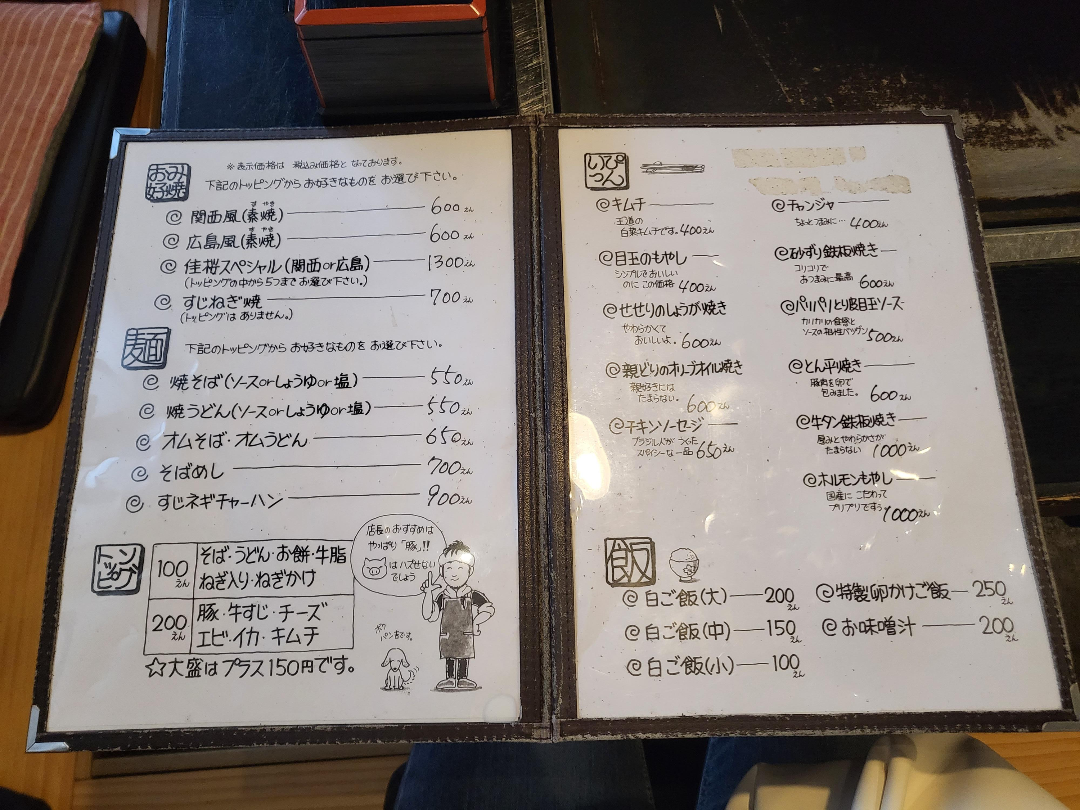 왼편이 오코노미야낀데 원하는 토핑을 얹을 수 있다. 좌측 하단에 있는 100~200엔 메뉴 내에서 선택 가능.