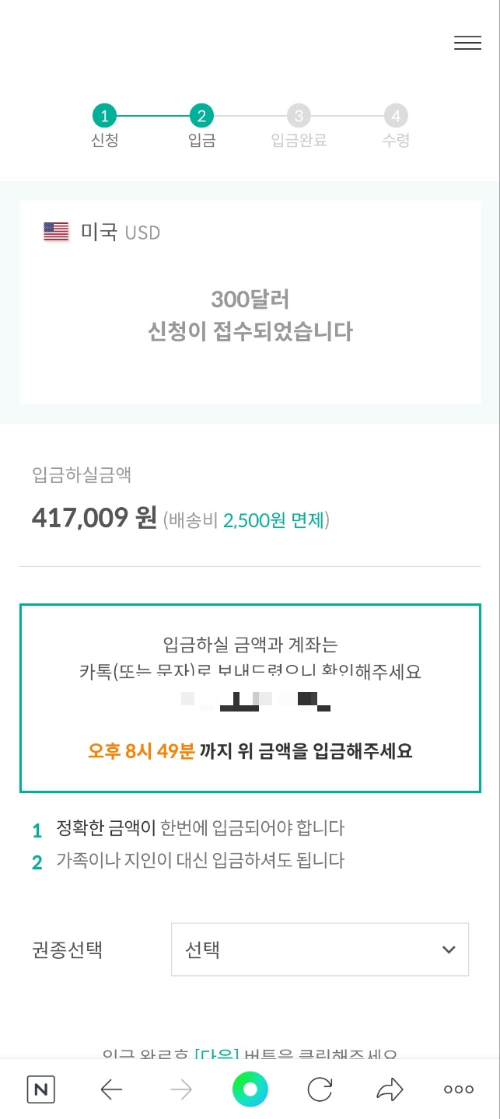 그럼 입금할 금액과 입금할 계좌가 바로 나오는데 정확하게 입력을 해야 한다.