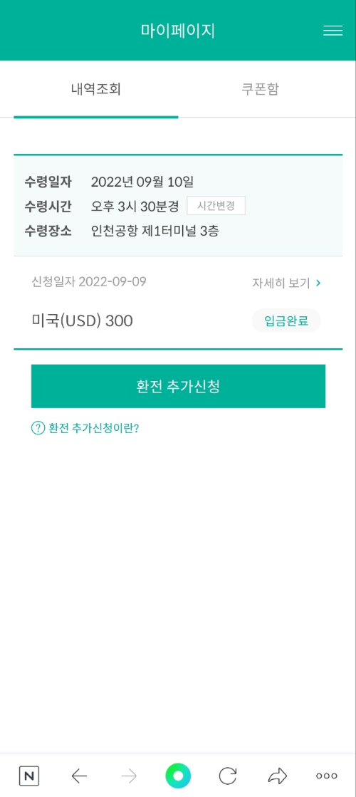 입금을 하고 나면 이렇게 톡과 마이뱅크에서 모두 입금 확인 내용을 볼 수 있다. 전화를 하면 배송 담당자가 직접 찾아와서 준다는 것이 신기하다. 3년 전엔 ATM기에서 뽑거나 공항 내 은행 창구에서 받았는데 찾아오는 서비스라니 발전이 빠르군..