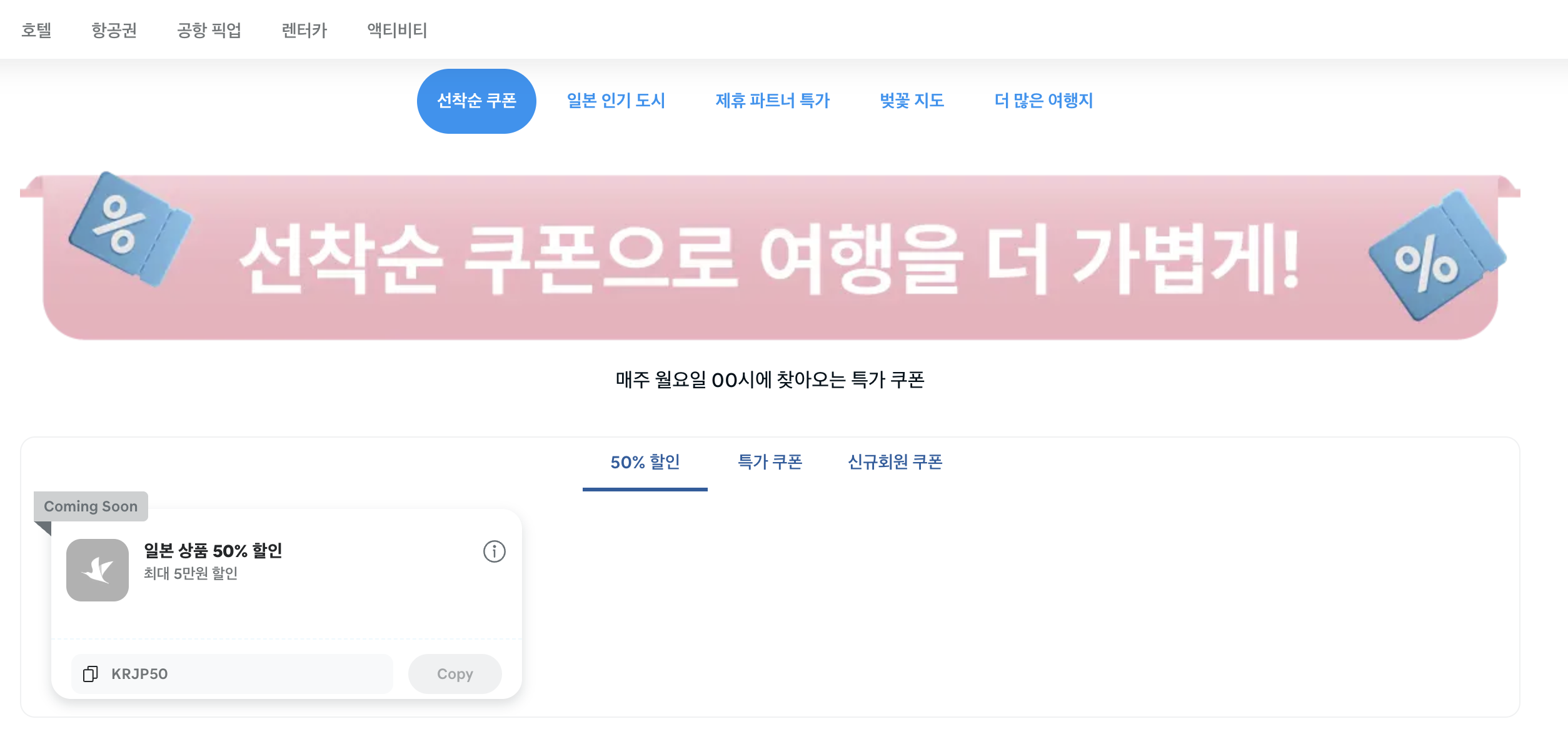 | 내용 | 일본 상품 선착순 50% 할인쿠폰 제공 및 중화권 쿠폰 제공 중화권 항공권 최대 1만 5천원 할인 쿠폰 (중국, 대만, 홍콩, 마카오) |